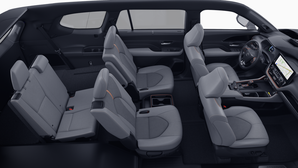 - 7-passenger seating with second-row fold-down captain's chairs and fold-down inboard armrests, adjustable headrests and two cup holders mounted on the floor; and 60/40 split, fold-down third-row seats with sliding headrests and recline function