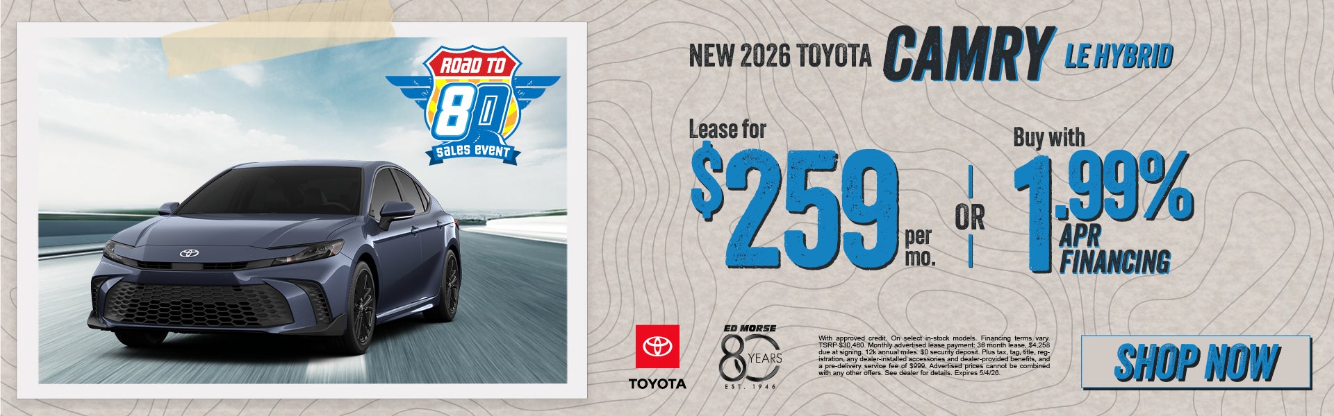 With approved credit. On select in-stock models. Financing terms vary. TSRP $30,460. Monthly advertised lease payment: 36 month lease, $4,258 due at signing. 12k annual miles. $0 security deposit. Plus tax, tag, title, registration, any dealer-installed accessories and dealer-provided benefits, and a pre-delivery service fee of $999. Advertised prices cannot be combined with any other offers. See dealer for details. Expires 5/4/26.