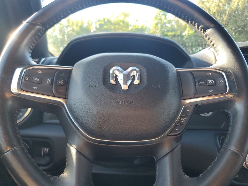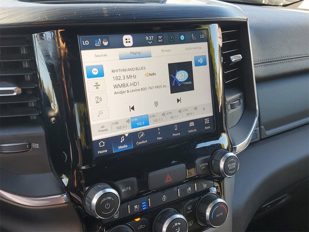 Equipped with Quick Order Package 27H Laramie, 10 Speakers, 3 Rear Seat Head Restraints, 3.21 Rear Axle Ratio, 4 Way Front Headrests, 4-Wheel Disc Brakes, 48V Belt Starter Generator, 4G LTE Wi-Fi Hot Spot, ABS brakes, Air Conditioning, Alloy wheels, AM/FM radio: SiriusXM with 360L, Apple CarPlay, Apple CarPlay/Android Auto, Audio memory, Auto-dimming door mirrors, Auto-Dimming Exterior Driver Mirror, Auto-dimming Rear-View mirror, Automatic temperature control, Brake assist, Bumpers: chrome, Chrome Exterior Mirrors, Compass, Connected Travel & Traffic Services, Connectivity - US/Canada, Convex Wide-Angle Exterior Mirror Insert, Delay-off headlights, Driver door bin, Driver Seat Memory, Driver vanity mirror, Dual front impact airbags, Dual front side impact airbags, Electronic Stability Control, Exterior Mirrors Courtesy Lamps, Exterior Mirrors w/Heating Element, Exterior Mirrors w/Memory, Exterior Mirrors w/Supplemental Signals, Exterior Parking Camera Rear, For Details, Visit DriveUconnect.com, For More Info, Call 800-643-2112, Front anti-roll bar, Front Center Armrest w/Storage, Front dual zone A/C, Front fog lights, Front License Plate Bracket, Front reading lights, Front Seat Back Map Pockets, Front wheel independent suspension, Fully automatic headlights, Garage door transmitter, Global Telematics Box Module (TBM), Google Android Auto, GPS Navigation, HD Radio, Heated door mirrors, Heated Front Seats, Heated front seats, Heated Steering Wheel, Heated steering wheel, Illuminated entry, Integrated Voice Command w/Bluetooth®, Leather steering wheel, Leather Trim 40/20/40 Bench Seat, Low tire pressure warning, Manufacturer's Statement of Origin, Memory seat, Navigation System, Occupant sensing airbag, Outside temperature display, Overhead airbag, Overhead console, Panic alarm, Passenger door bin, Passenger vanity mirror, Power 2-Way Driver Lumbar Adjust, Power 2-Way Passenger Lumbar Adjust, Power 8-Way Driver & Passenger Seats, Power door mirrors, Power driver seat, Power passenger seat, Power steering, Power windows, Power-Folding Mirrors, Radio data system, Radio: Uconnect 5 Nav w/8.4 Display, RAM Grille Badge - Chrome, Rear 60/40 Folding Seat, Rear anti-roll bar, Rear seat center armrest, Rear step bumper, Remote keyless entry, Security system, SiriusXM Radio Service, SiriusXM w/360L, Speed control, Split folding rear seat, Steering wheel mounted audio controls, Tachometer, Telescoping steering wheel, Tilt steering wheel, Traction control, Trip computer, Turn signal indicator mirrors, Variably intermittent wipers, Ventilated Front Seats, Ventilated front seats, Voltmeter, Wheels: 18 x 8 Aluminum Base Painted, and Wheels: 20 x 9 Premium Paint/PolisheD.